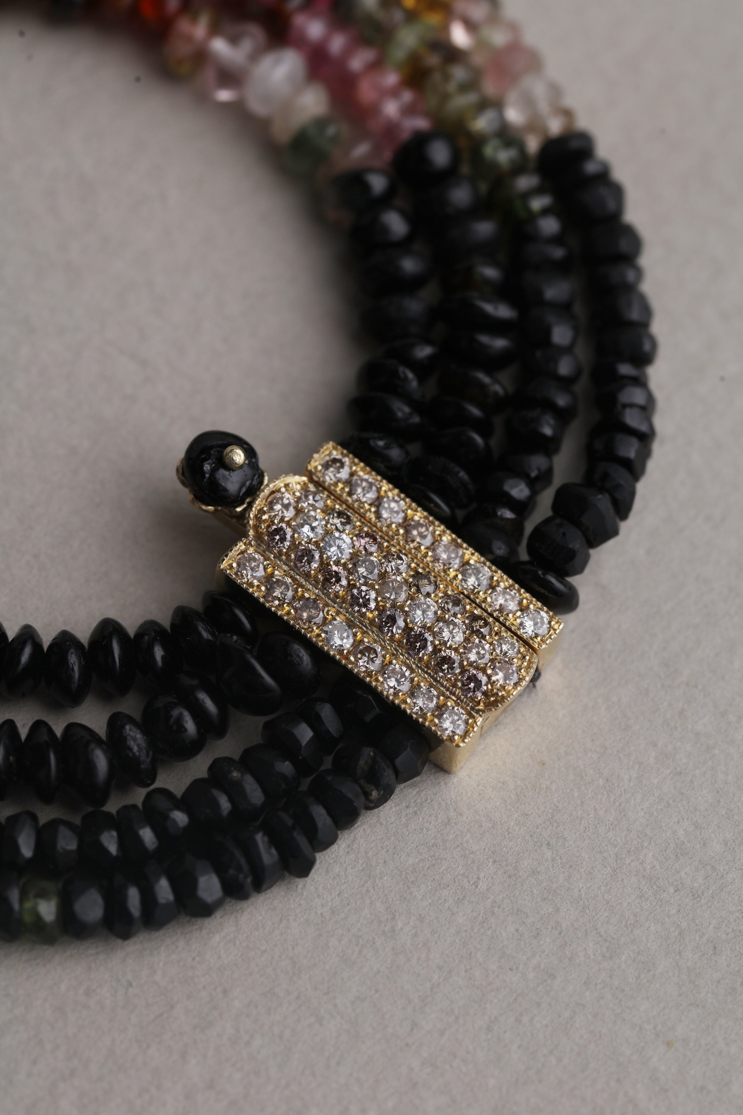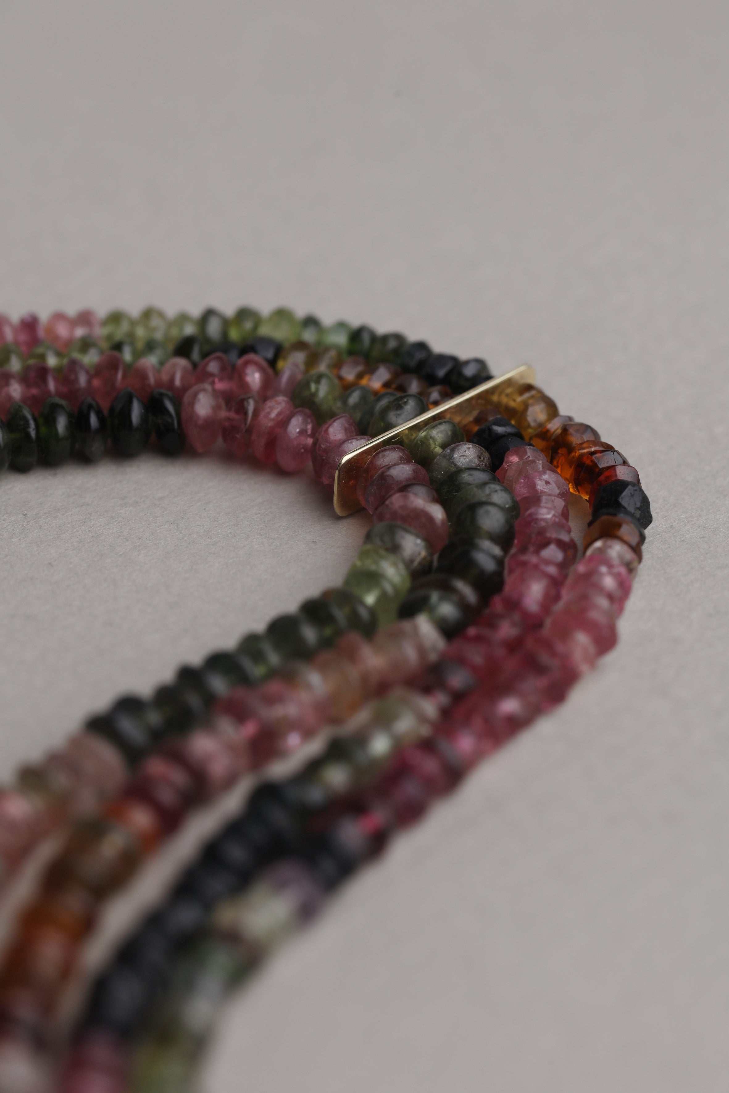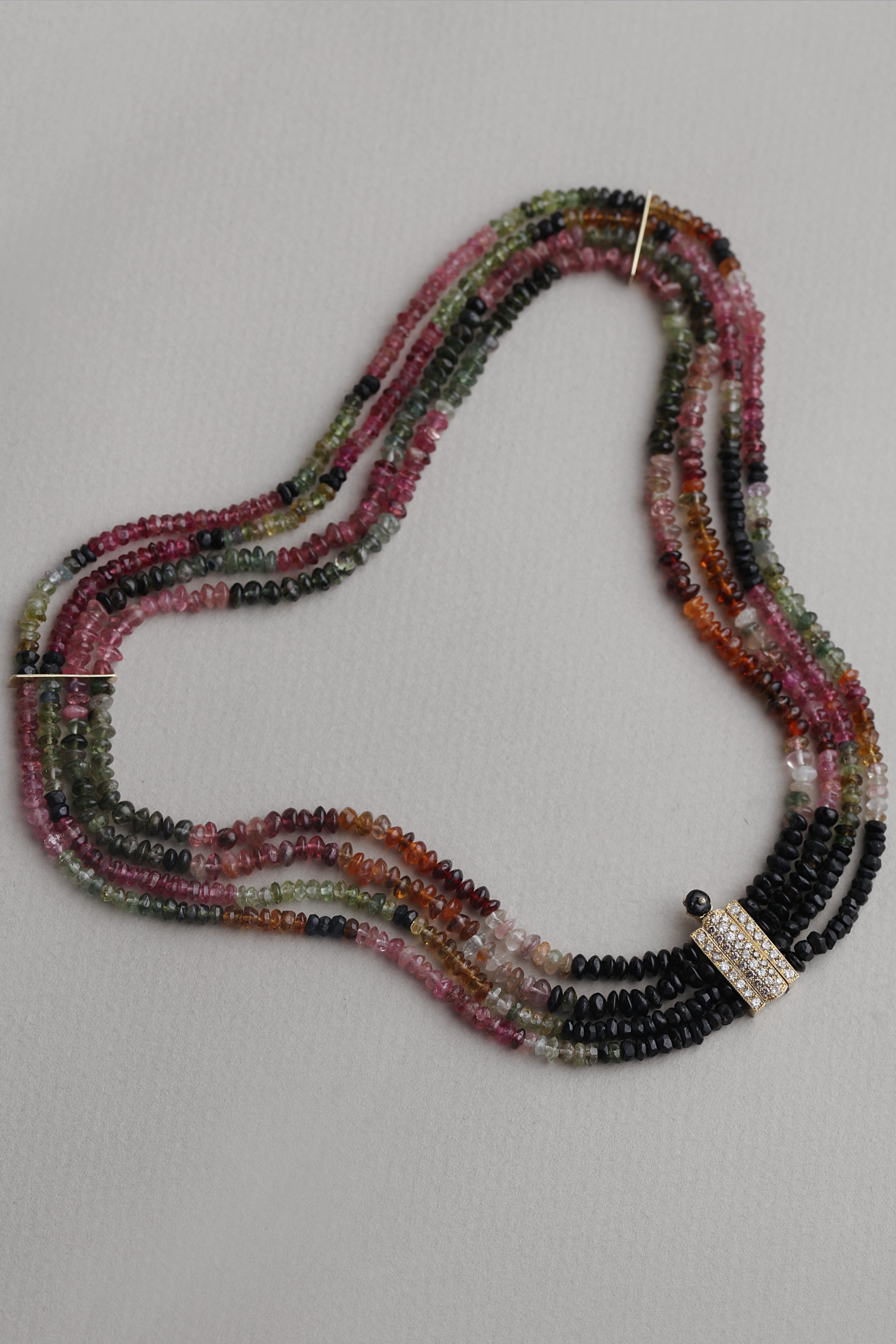 Crafted from a refined composition of sapphire, ruby, and emerald beads, this necklace brings together three precious stones, each carrying its own depth and character. The layered strands flow naturally along the neckline, creating a sense of movement and harmony through subtle contrasts of color. Finished with a pavé-set champagne diamond clasp, the design balances gemstone richness with understated elegance. Timeless and expressive, it is a piece defined by quiet confidence and enduring sophistication.